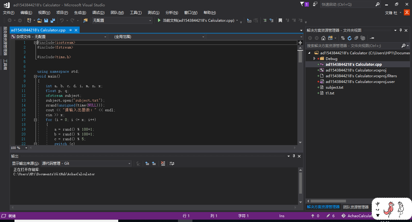 这次作业对我来说很有难度,刚开始看了作业要求一脸懵逼,看懂作业要求与教程都花费了一段时间,GitHub和vs之前都没用过,短时间用起来比较生疏,c++还没学完,代码写起来有点慢,这次代码应该写的不是很满意,很多想法都没实现,运算符的随机性没有写好,还有很多不足的地方。GitHub是全英文的,英语不好的话,怎么操作都不知道,学好计算机也要把英语好好学学。通过这次作业,让我收获颇丰,提前学习到了很多新的东西,像GIT和GitHub。在今后,一定多敲代码,增加代码量。