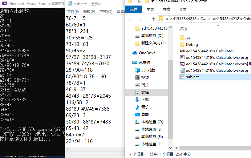 练习题生成好后,将生成的 n 道练习题及其对应的正确答案输出到一个文件 subject.txt 中。