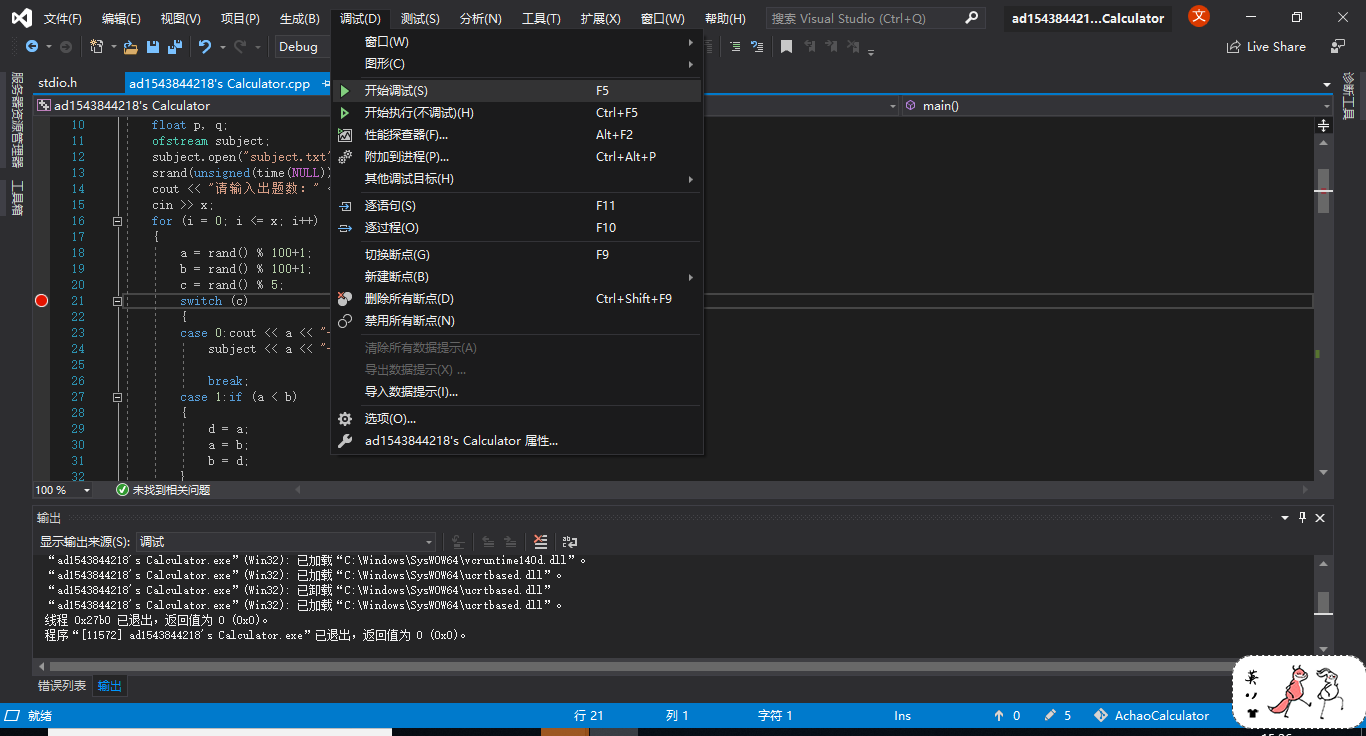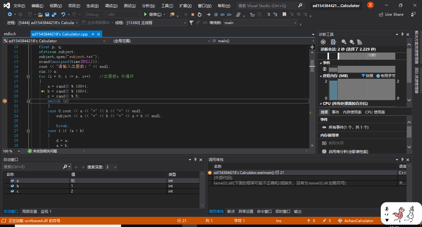 思路:随机产生题目很明显应该用srand()函数实现,数字范围用rand()随机。生成题目用一个外循环实现,生成数字和运算符用多个内循环实现。