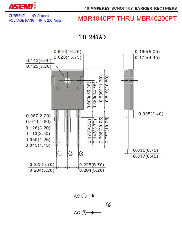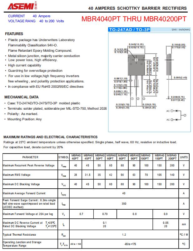 MBR40200PT的电性参数:正向电流40A;反向电压200V