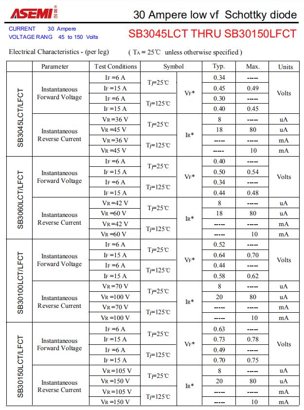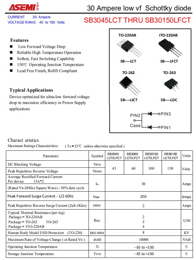 ASEMI品牌SB30100LCT是采用工艺芯片,该芯片具有良好的稳定性及抗冲击能力,能够持续保证了SB30100LCT的漏源电流30A,漏源击穿电压100V.