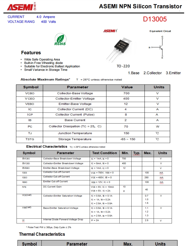 特性:NPN晶体管、三极管、4A 400V硅晶体管