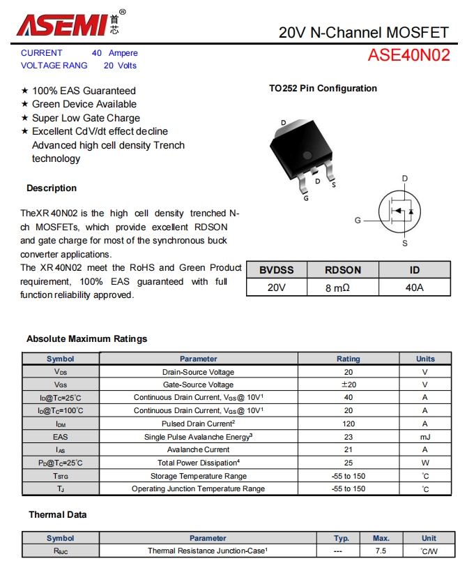 40N02的电性参数:最大漏源电流40A;漏源击穿电压20V