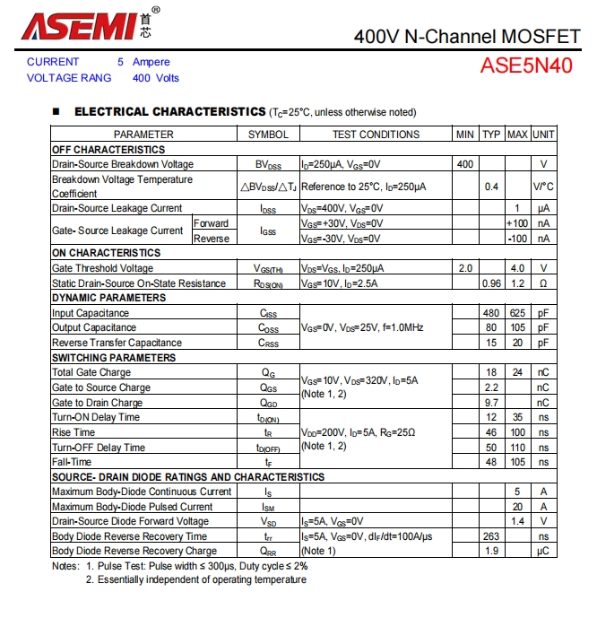 ASE5N40的快速开关特性(纳秒级响应时间)使其在PWM(脉宽调制)电路中表现优异,特别适用于高频开关电源和LED驱动,有效减少电磁干扰(EMI)并提升能效比。