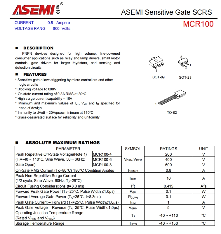 在电子设备追求高效化、小型化的今天,如何在小体积内实现精准电流控制与高可靠性,成为工程师的核心挑战。MCR100单向可控硅凭借其卓越的阻断能力与稳定性,成为家电、工控、新能源等领域的“隐形守护者”,以硬核性能重新定义小功率电力控制标准。