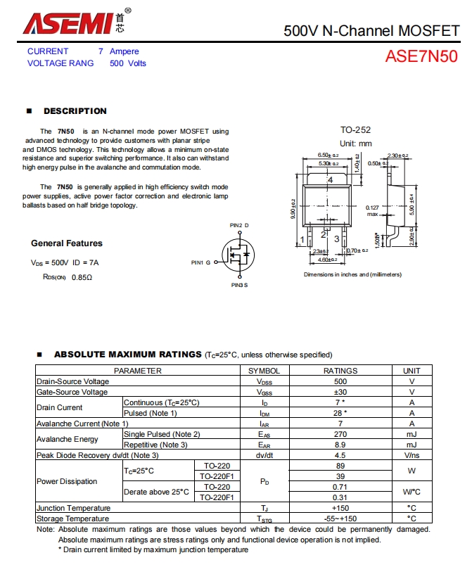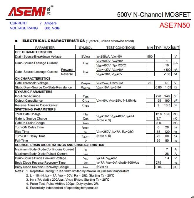 作为N沟道功率MOSFET的革新之作,7N50在多项关键参数上实现突破: