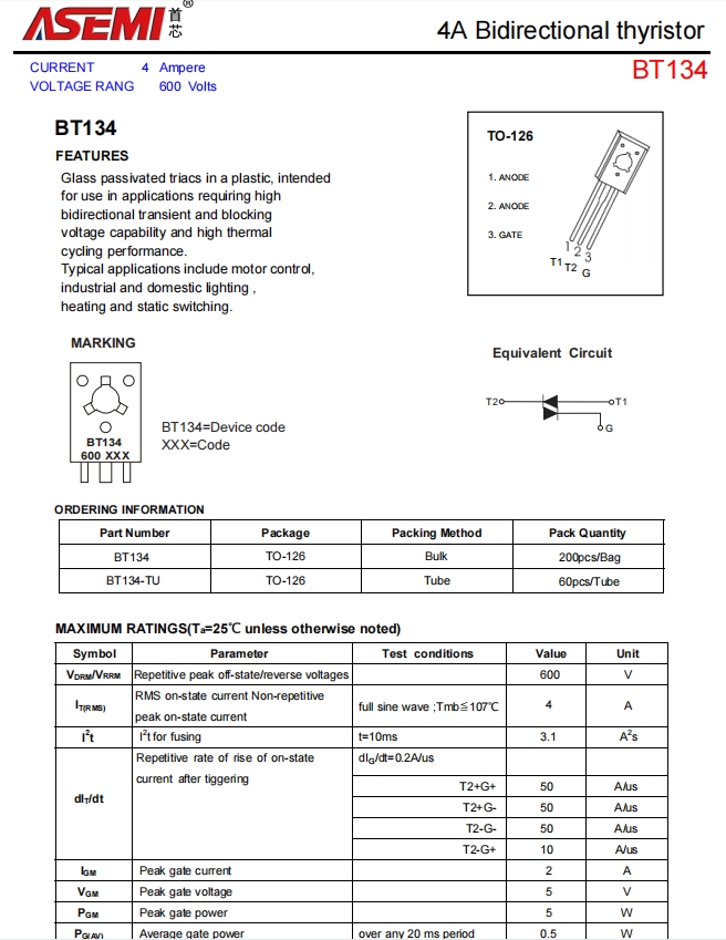 BT134支持正向和反向电压导通,简化了交流电路设计,适用于调光、调速等需双向控制的场景。