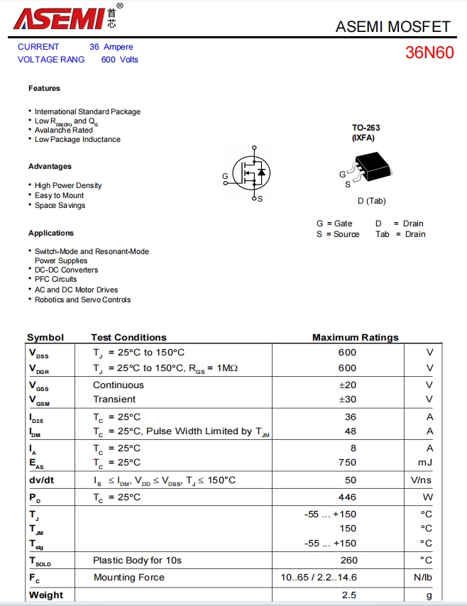 该款 MOS 管的漏源击穿电压高达 600V,这意味着它能够在各种高压环境下安全稳定地工作。无论是工业级的高压电路,还是对电压稳定性要求极高的精密电子设备,36N60 MOS 管都能凭借其出色的耐压能力,有效避免因电压波动或过高而导致的器件损坏,极大地提高了电路的可靠性和稳定性。