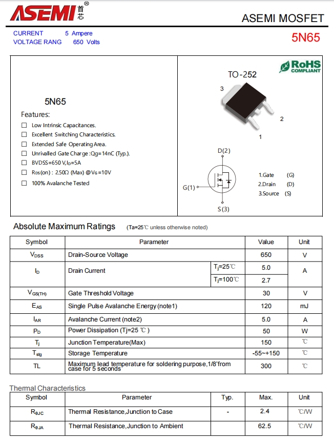 高可靠性:先进的平面技术和严格的生产工艺,赋予了 5N65 MOS 管卓越的可靠性。在面对电压波动、温度变化等复杂工况时,依然能够稳定工作,降低了设备故障风险,提高了系统的整体稳定性。