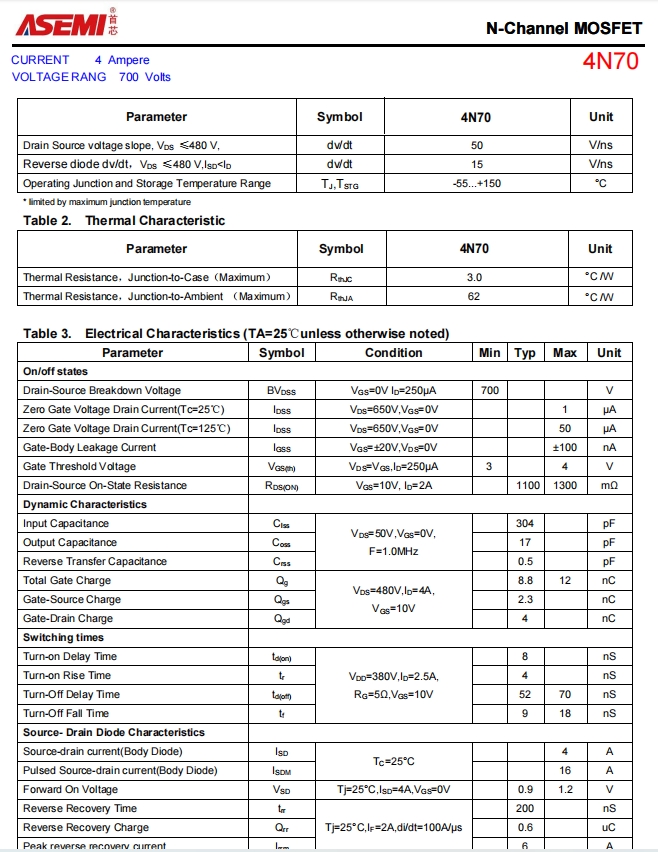 在导通电阻(RDS (ON))方面,当 VGS = 10V 时,4N70 MOS 管仅为 2600mΩ,低导通电阻意味着在电流通过时,产生的功耗极小,有效提升了能源利用效率,降低了设备运行成本与发热问题。同时,它的最大漏极电流(ID)可达 4A,足以满足多种中等功率需求的电路应用。