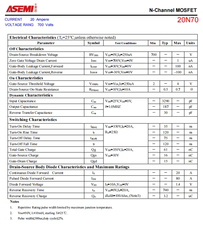 在开关速度方面,20N70 MOS 管同样表现出色。它能够快速地在导通与截止两种状态间切换,这一特性在高频电路中尤为关键。当电路需要处理高频信号时,20N70 MOS 管可以迅速响应,准确地控制电流的通断,确保信号的稳定传输与处理,为设备的高效运行提供坚实保障。