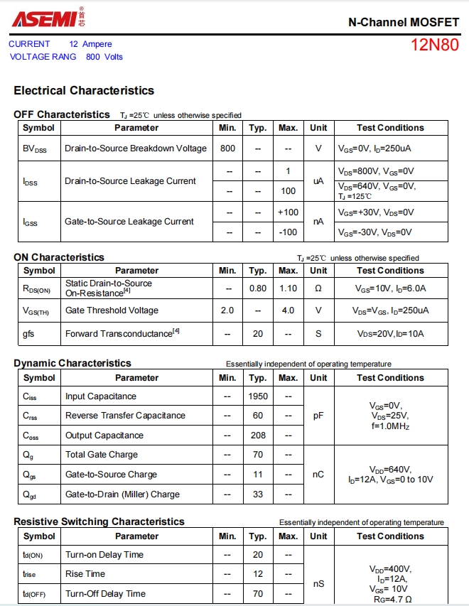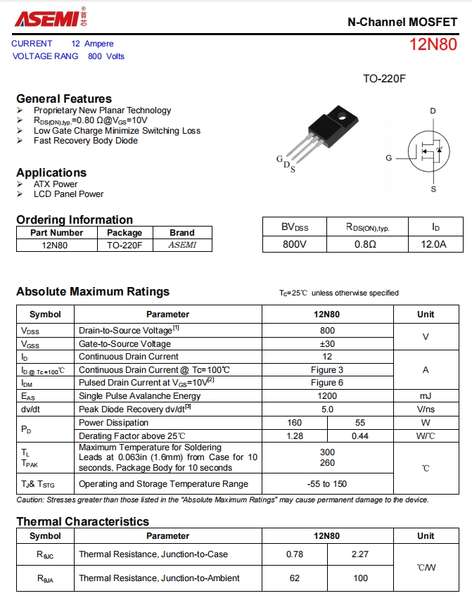总之,12N80 MOS 管以其优异的电气性能、先进的制造工艺和广泛的应用范围,成为了现代电子设备中不可或缺的关键部件。无论是追求高效能的电源设计,还是对可靠性要求极高的复杂电路,12N80 MOS 管都能完美胜任,为电子技术的创新发展注入强大动力。选择 12N80 MOS 管,就是选择卓越的性能与可靠的品质,开启高效、稳定的电子应用新时代。