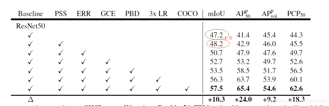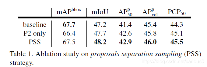 用PSS,mIoU提高了1.0比baseline。也和只用P2特征图比较了,mIoU减少了0.5,bbox mAP也更坏了。如表1所示,APp指标在PSS下有一定程度的提高,说明提出的方法是有效的。