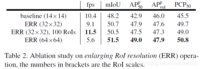 如表2所示我们用32*32、64*64的ROI,发现比14*14提升了性能。ERR(32*32)比baseline (14*14)mIoU提升了2.8。APp指标比baseline(14*14)分别提高了5.0,1.7,4.4。而且解析分支的ROI是并行的,所以速度之比baseline(14*14)减少了12%((10.4-9.1)/10.4)。而且我们可以通过减少ROI的数量来增加速度,如果我们使用100个ROI速度提升率,精度基本没有下降。相对于32*32,64*64的ROI可以继续提升精度,但是考虑到速度精度均衡,我们用32*32的更有效。