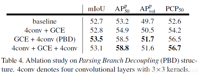 把解析分支分为3个部分。如表4所示,before GCE是不必需的,我们推测是GCE模块本身可以进行语义空间转换。另一方面,after GCE可以显著提高。考虑到速度和精度均衡,我们采用GCE+4个3*3 512个通道(PBD)作为解析分支.