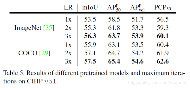 增加迭代次数是提高性能的常见方法。如表5所示,我们在CIHP上2倍和3倍的迭代,提升是很明显的。