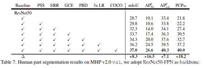 如表6所示,有了所有这些提出的方法,我们的Parsing R-cnn比baseline提升更多