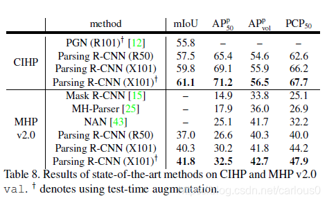 对于MHPv2.0数据集,我们也进行了这些比较,也和其他现有方法比较了。在AP上提高了,不幸的是,其他方法没有给出mIoU