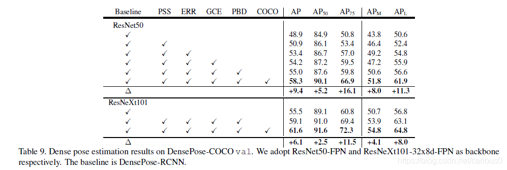 Component Ablation Studies on DensePose-COCO.消融实验。