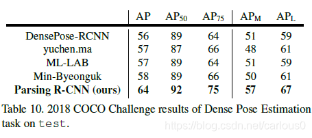 2从实例级上,我们用APp,用一个人体实例内不同语义部件的部件级iou决定一个实例是否为true posistive。用APp50,APpvol。前者有一个IOU阈值为0.5,后者是iou阈值从0.1到0.9变化APp的均值。还用了PCP(percentage of Correctly parsed semantic parts)
