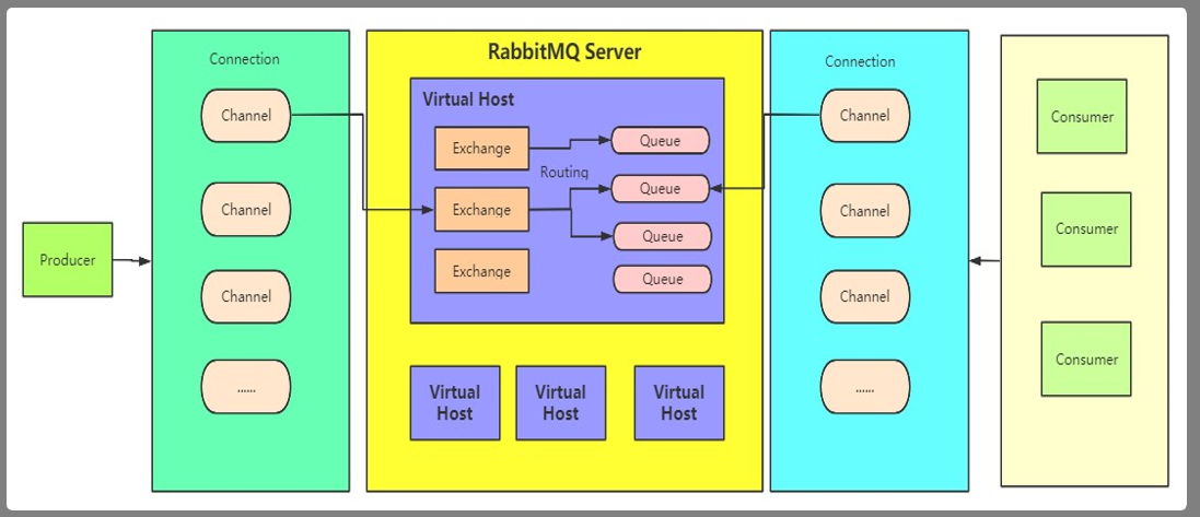 RabbitMQ出于服务器复用的想法,可以在一个RabbitMQ集群中划分出多个虚拟主机,每一个虚拟主机都有AMQP的全套基础组件,并且可以针对每个虚拟主机进行权限以及数据分配,并且不同虚拟主机之间是完全隔离的。