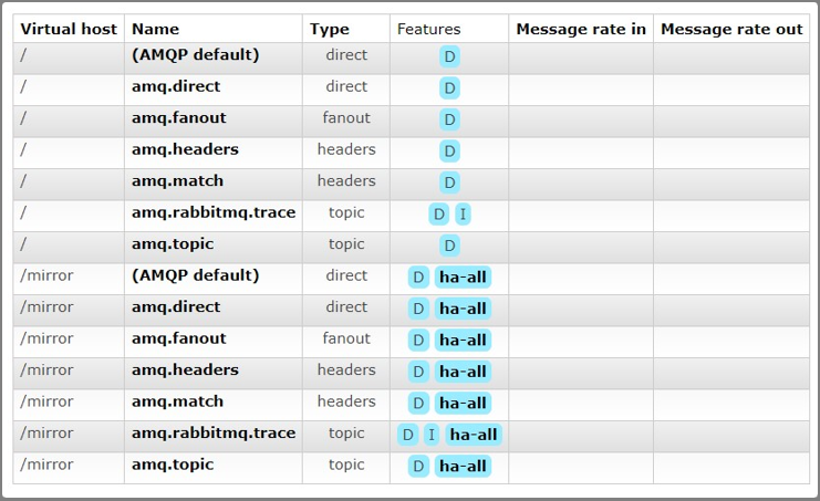 这是RabbitMQ中进行数据路由的重要组件。消息发送到RabbitMQ中后,会首先进入一个交换机,然后由交换机负责将数据转发到不同的队列中。RabbitMQ中有多种不同类型的交换机来支持不同的路由策略。从Web管理界面就能看到,在每个虚拟主机中,RabbitMQ都会默认创建几个不同类型的交换机来。