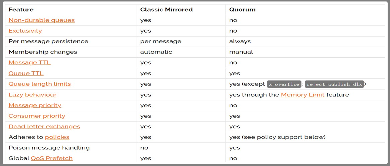 4、 队列消息积压严重 : 如果队列中的消息很大,或者积压的消息很多,就不要使用Quorum队列。Quorum队列当前会将所有消息始终保存在内存中,直到达到内存使用极限。