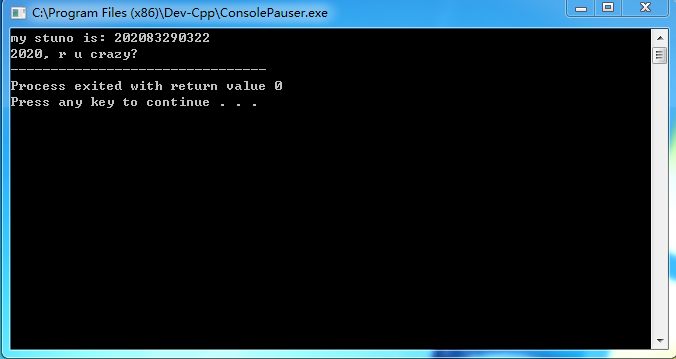 #include <stdio.h> int main() { printf("my stuno is: 202083290322\n2020, r u crazy?"); return 0; }