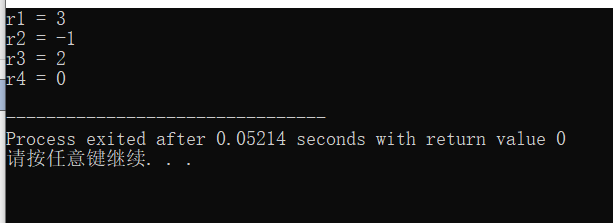 #include <stdio.h> int main() { int x, y; int r1, r2, r3, r4; x = 1; y = 2; r1 = x + y; r2 = x - y; r3 = x * y; r4 = x / y; printf("r1 = %d\n", r1); printf("r2 = %d\n", r2); printf("r3 = %d\n", r3); printf("r4 = %d\n", r4); return 0; }