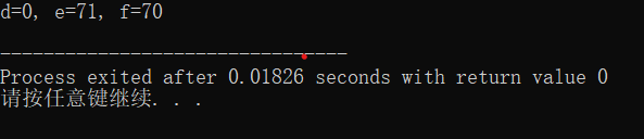 #include <stdio.h> int main () { int a=5,b=7,c=100,d,e,f; d=a/b*c; e=a*c/b; f=c/b*a; printf("d=%d, e=%d, f=%d\n",d,e,f); return 0; }