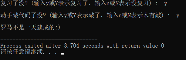 #include <stdio.h> int main() { char ans1, ans2; printf("复习了没? (输入y或Y表示复习了,输入n或N表示没复习) : "); ans1 = getchar(); getchar(); printf("\n动手敲代码了没? (输入y或Y表示敲了,输入n或N表示木有敲) : "); ans2 = getchar(); if((ans1=='y'||ans1=='Y')&&(ans2=='y'||ans2=='Y')) printf("\n罗马不是一天建成的:)\n"); else printf("\n罗马不是一天毁灭的。。。\n"); return 0; }