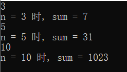 #include <stdio.h> #include <math.h> int main () { int sum,n; while(scanf("%d",&n)!=EOF) { sum=(1-pow(2,n))/(1-2); printf("n = %d 时, sum = %d\n",n,sum); } return 0; }