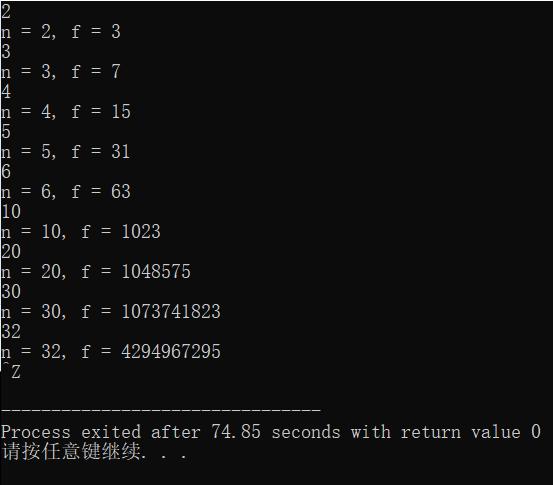 #include <stdio.h> long long fun(int n); // 函数声明 int main() { int n; long long f; while(scanf("%d", &n) != EOF) { f = fun(n); // 函数调用 printf("n = %d, f = %lld\n", n, f); } return 0; } // 函数定义 long long fun(int n) { if(n==1) return 1; else return (fun(n-1)+1)*2-1; }