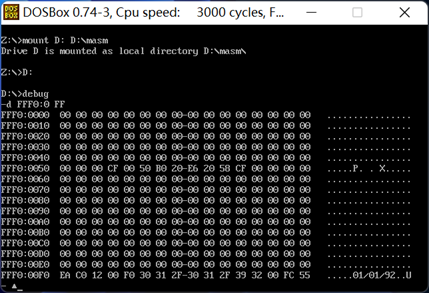 通过本次实验我学到了许多关于汇编语言的实践操作方面的知识,了解并实践了如何在Dosbox中运用在书本上学到的汇编语言程序设计的知识。我发现在使用e命令在显存部分修改值后,在屏幕上会显示相对应的图案,如果继续使用其他代码如d命令查看等,将输出在屏幕上的图案覆盖掉后,因为屏幕上的内容发生改变,所以显存中的数据也会随之发生改变,这就导致连续的两次d命令查看内存中的内容可能存在差异。