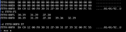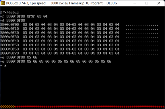 上图为查看该段内存内容,并尝试使用e命令对其进行修改,修改后发现屏幕下方的部分图案发生改变。