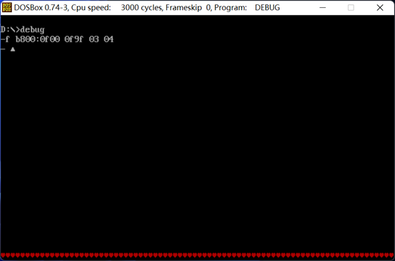 上图为使用f命令批量填充内存单元后的情形,屏幕下方出现许多图案。