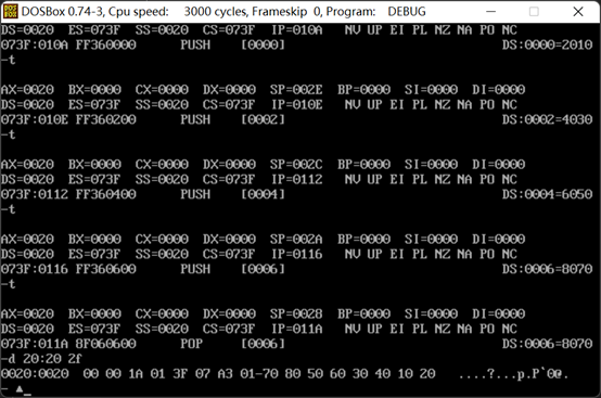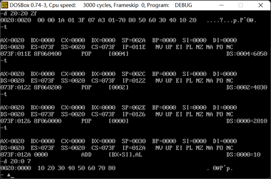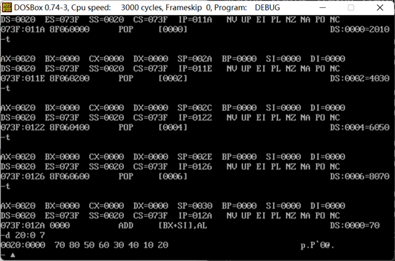 按照截图修改pop指令的顺序后,使用d命令查看发现顺序发生改变,原因是因为出栈的顺序为70 80 50 60 30 40 10 20