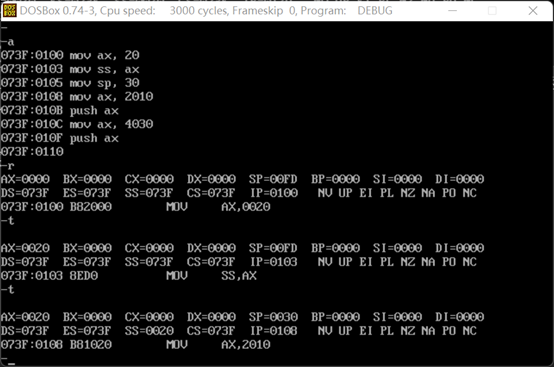 从实验中发现截图中第一处黄线划的08 01为当前代码的偏移地址,第二处黄线划的是当前代码的段地址,执行完mov sp, 30后偏移地址为0108,最后执行完push ax后在0110 即 10 01 而在执行入栈操作后,栈顶指针向前移动2个字节,所以整体向前移动2个字节。