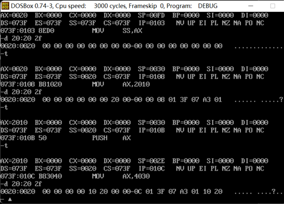 问题1:使用t命令单步执行mov ss, ax时,并不是单步执行完这一条指令就暂停,而是紧接着执行下一条指令即mov sp, 30。
