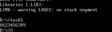 1 assume cs:code 2 code segment 3 start: 4 mov cx, 10 5 mov dl, '0' 6 s: mov ah, 2 7 int 21h 8 add dl, 1 9 loop s 10 11 mov ah, 4ch 12 int 21h 13 code ends 14 end start