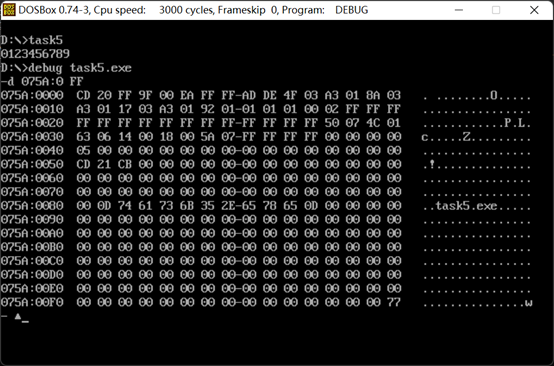 上为在debug中查看task5.exe的程序段前缀PSP的截图,由图可见,程序前两个 字节是为CD 20。