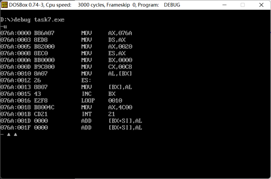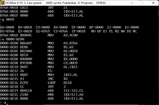 1 assume cs:code 2 code segment 3 mov ax, 076Ah 4 mov ds, ax 5 mov ax, 0020h 6 mov es, ax 7 mov bx, 0 8 mov cx, 200 9 s: mov al, [bx] 10 mov es:[bx], al 11 inc bx 12 loop s 13 14 mov ax, 4c00h 15 int 21h 16 code ends 17 end