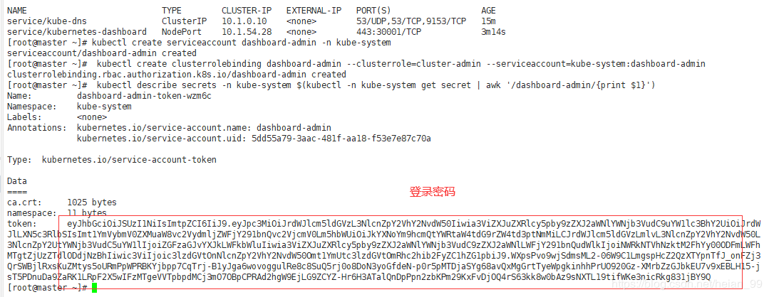 kubectl describe secrets -n kube-system $(kubectl -n kube-system get secret | awk '/dashboard-admin/{print $1}')