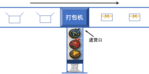 下图是一条盲盒包装流水线的示意图。首先徽章通过进货口被压入货栈里,空盒在履带上从左向右传送。每次从货栈里弹出一枚徽章,进入打包机,装入一只空盒,打包后继续向右边传送。当货栈为空时,打包机会暂停,等待下一批徽章压入货栈。