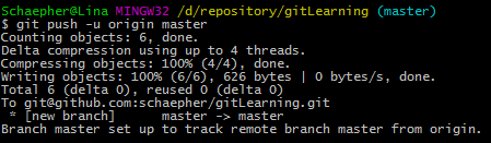 执行 git push -u origin master 将本地仓库上传至Github的仓库并进行关联: