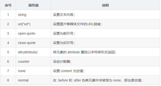 ::before ::after 必须配合content属性一起使用,以下是content的常用属性值: