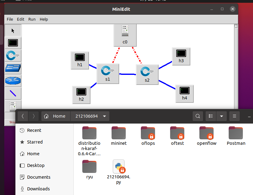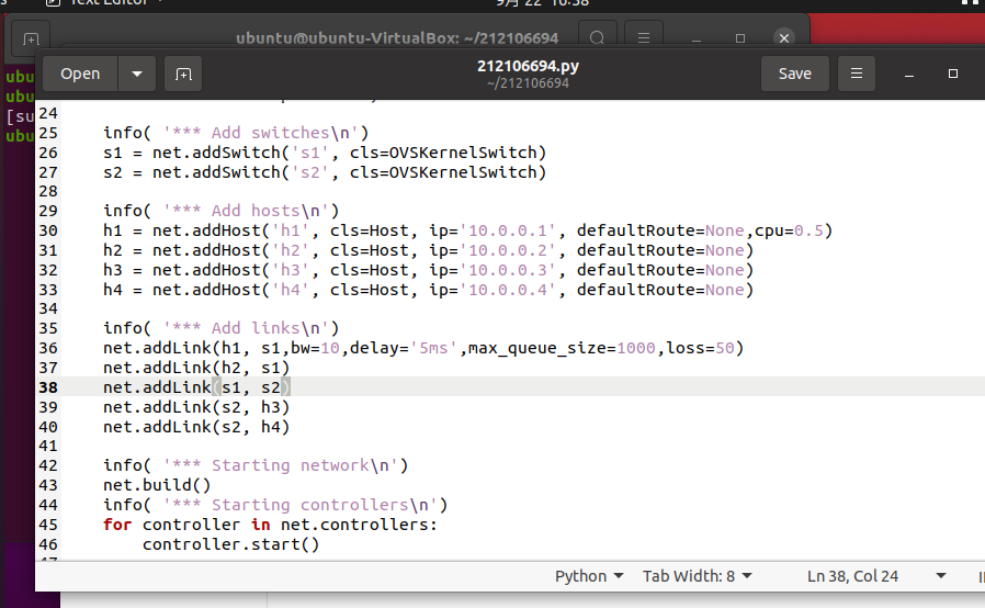 1.使用Mininet可视化工具,生成下图所示的拓扑,并保存拓扑文件名为学号.py。