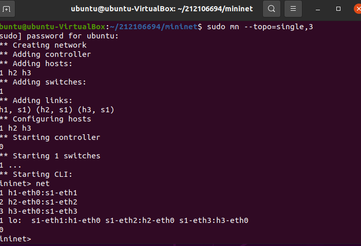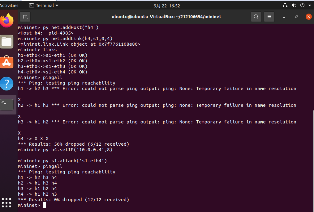 3.在2 b)的基础上,在Mininet交互界面上新增1台主机并且连接到交换机上,再测试新拓扑的连通性。