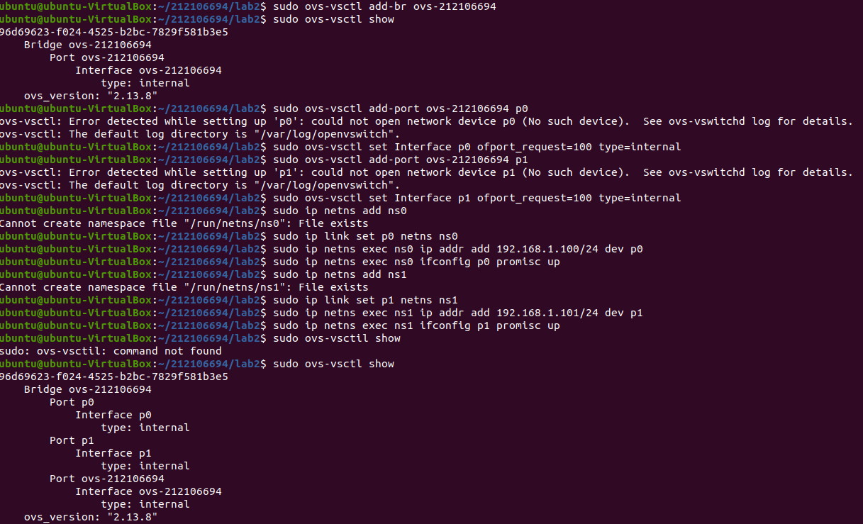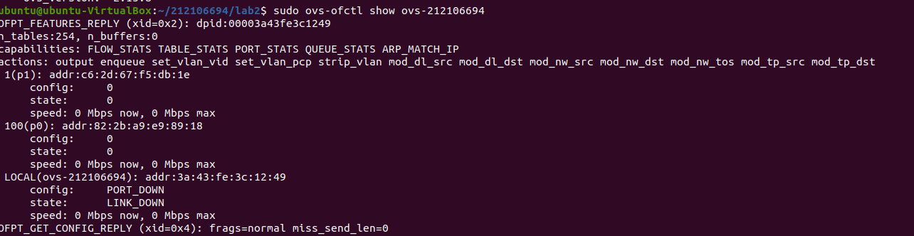 a) /home/用户名/学号/lab2/目录下执行ovs-vsctl show命令、以及p0和p1连通性测试的执行结果截图;