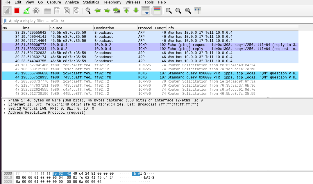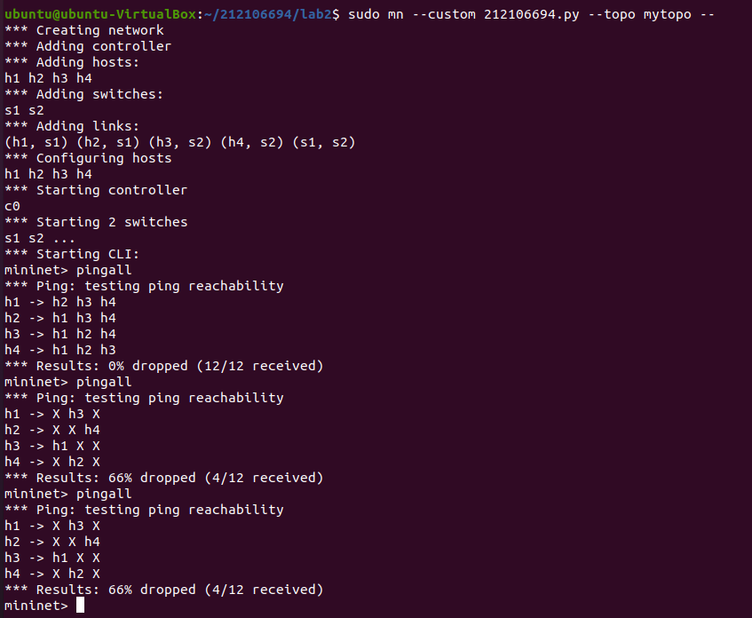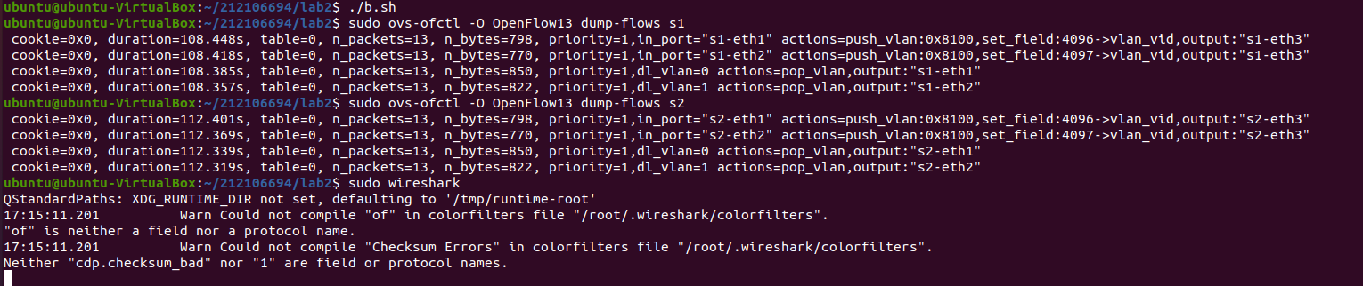 b) /home/用户名/学号/lab2/目录下开启Mininet CLI并执行pingall命令的截图、上述目录下查看OVS流表的命令结果截图,wireshark抓包截图